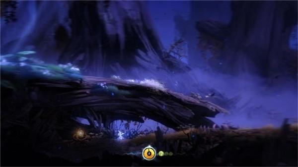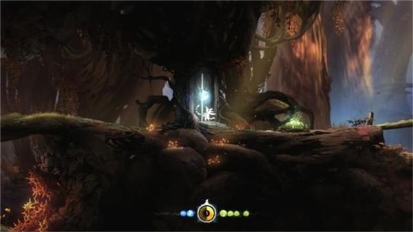 跳上倾斜的树干,在左侧的死胡同处,按鼠标左键让奥日捡起一道小小光芒,这道光芒是一个名为赛安的精灵,他是精灵之树的双眼与光芒,此时奥日获得了第一个技能精灵之火,这里就相当于是第一个圣地(奥日获得圣地当中的技能之后可以获得一次自动存档的机会)。