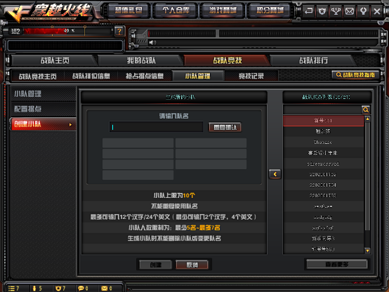 战队竞技的玩法是以战队小队为单位的。小队可以由队长、副队长、秘书在“战队竞技”分页下的“小队管理”界面创建。每个战队最多可以建立10个小队,每个小队最少5人,最多7人。