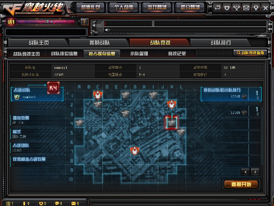 例如:A小队在前两周一共进行了28次5V5战队排位赛,并且被选取为优秀小队。则在周日的23点时被分配一个随机的据点(如F-4),并且A小队在F-4的起始据点积分为28分。