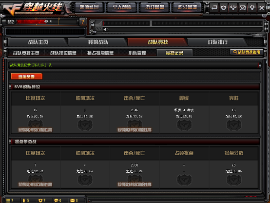 在“战队竞技”下的“竞技记录”分页记录着本战队5V5战队排位和据点争夺战的成绩,并且成绩好的项目在赛季结束时会获得勋章,彰显战队实力。