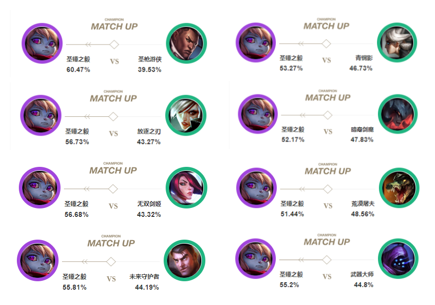 上单波比在面对以上的英雄时,胜率都是非常不错的。特别是现在重回热门的上单青钢影,选出上单波比是一个非常不错的选择!