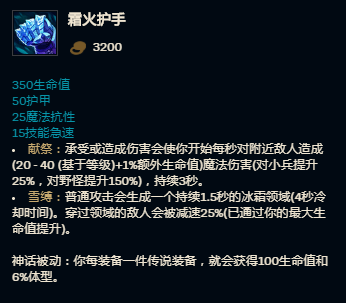 冰霜护手是一个神话装备,属性为生命值+双抗+技能急速非常完美的肉装属性。冰霜护手的被动效果【献祭】可以对附近的敌人造成灼烧效果,这对于波比清线和对拼都有着不错的提升,冰霜护手的第二个被动是【雪缚】普攻可以制造一个AOE减速带,1.5秒的减速能很好的黏住敌人和命中波比的二段Q技能。
