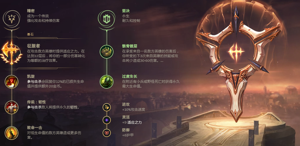 1. 主天赋选择精密:征服者+凯旋+传说:韧性+致命一击 副天赋选择坚决:过度生长+骸骨镀层。