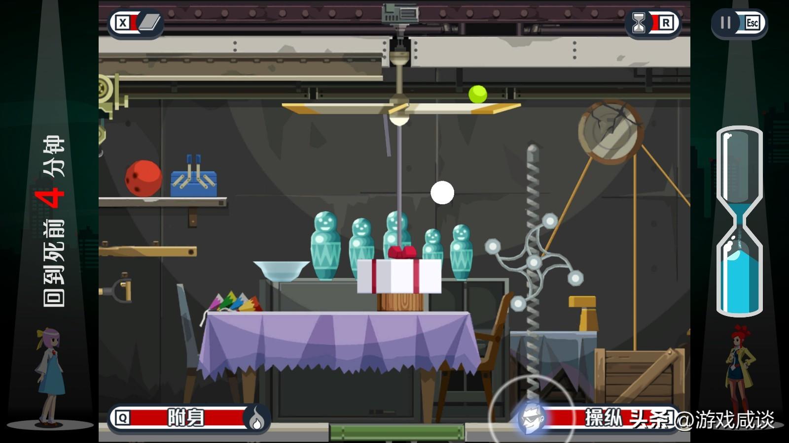 实际的游戏操作里,通过附身的方式改变现场物体之间的相对位置是一件很有难度的事情,因为这里的玩法设计非常精妙,本质上是一种动态的解谜,需要玩家对现场的状态有一个整体的了解,并且需要对一些情况有足够准确的预判,这时候往往就需要玩家有很强的反应力,抓住改变命运的瞬间机会。比如在凛音会被密室机关枪杀的一个剧情中,西塞尔需要在她进入密室的时候进入附身状态,通过触发一个铁锹的挥动来击飞触发机关用的小球,从而让凛音不会被杀死,活下来的凛音会帮助西塞尔进行调查,两人的命运自然因此而改变。而这种改变每一次都足以产生蝴蝶效应,让这个本来无从调查的案子产生转机。