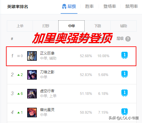 R技能现在能够为施法区域内的所有友军提供自己W技能的魔法护盾了,这就意味着加里奥的支援能力得到了强化,同时在功能性方面有了综合性的提升。另外加里奥充足的技能伤害,以及强力的控制能力,都让他在这个版本找到了最适合的打法,登顶中单榜首也就顺理成章了。