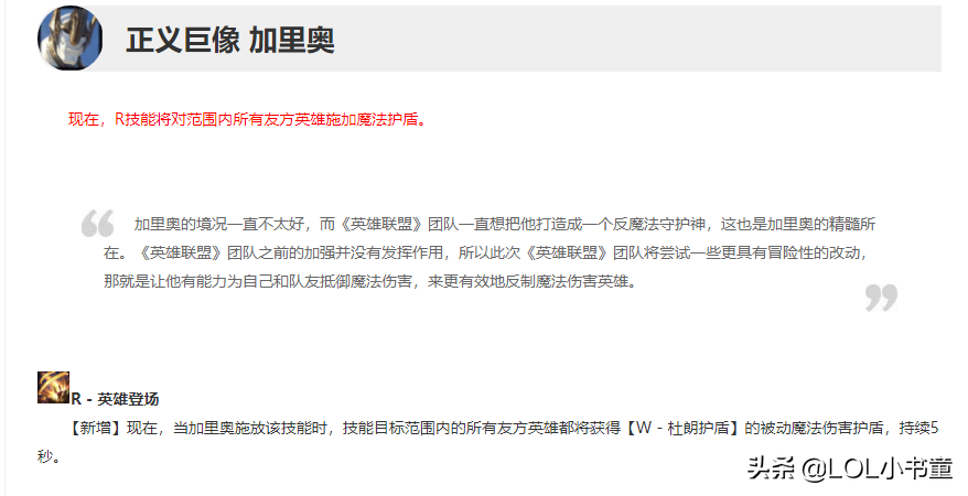 综合来看加里奥能够在10.8版本重返巅峰,还要归功于10.7版本对于加里奥的加强。其实自从加里奥的“W闪”连招被取消之后,这个英雄的定位瞬间坍塌,强度锐减,再也没有当年那种强势的团战控制能力了。鉴于这种情况,官方也终于心软:那就加强一下大招吧!