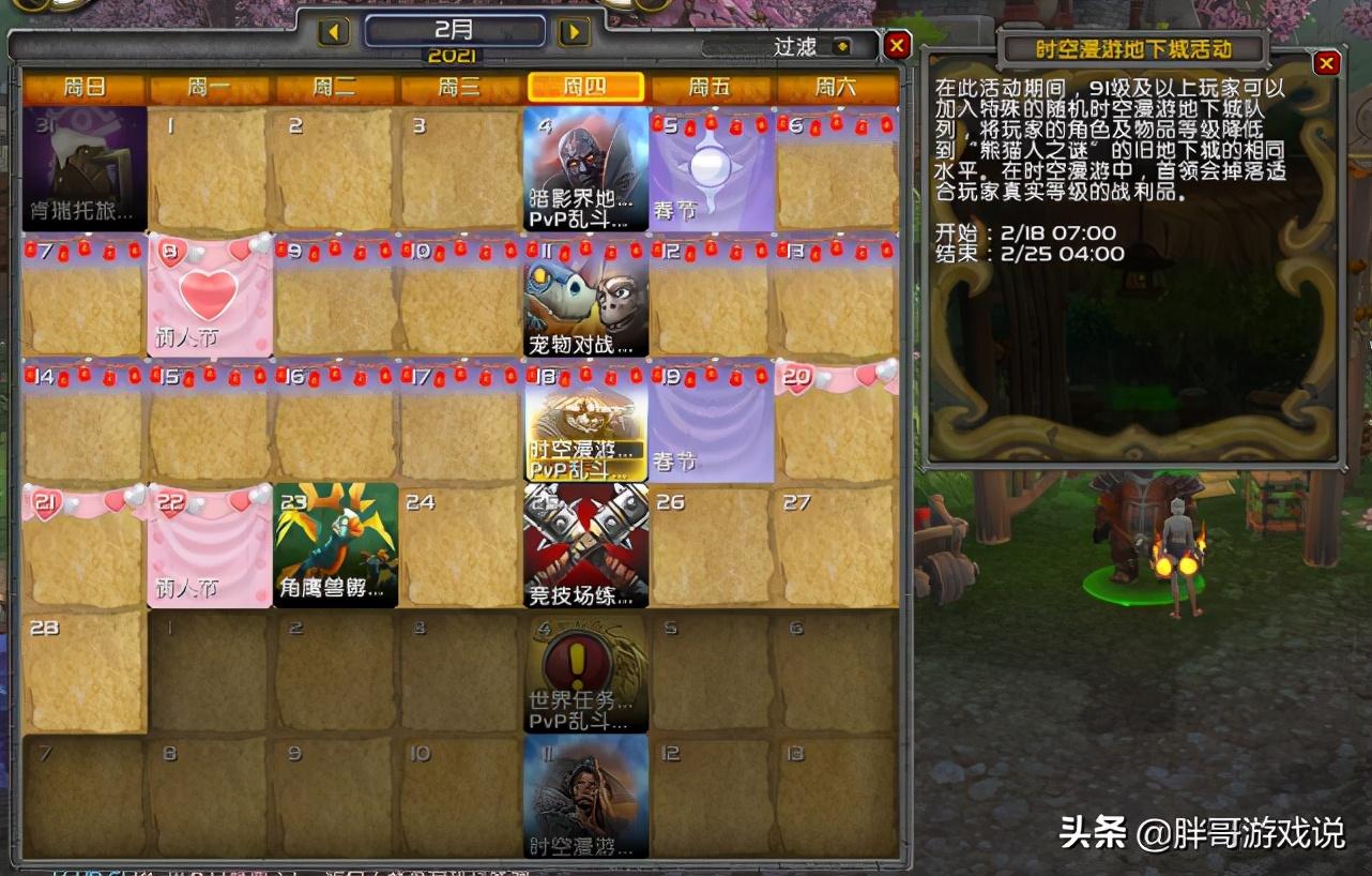 前面三种方法适合对声望需求比较迫切的玩家,而第四种方法则属于咸鱼玩家随缘提升方法,等待潘达利亚时光漫游开启的时候,打时光副本,用时光扭曲徽章就可以去永恒岛中间找NPC兑换声望。不过9.0版本跳票导致所有时光漫游都延后了,从游戏内的日历来看,下一次熊猫人时光周要到明年2月份。