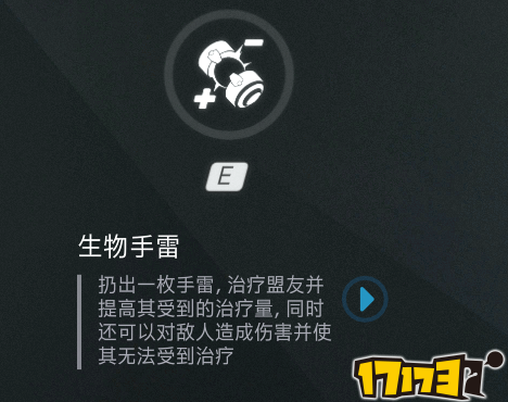 安娜的E技能生物手雷,有轻微抛物线,以手雷落点为中心半径2米圆形形成一个瞬间的生物立场,对立场内友军恢复100HP并5秒内增加约100%的治疗量,这个治疗量受其他英雄加血技能影响,但是不受血包影响,。对立场内敌人造成60点伤害并5秒内使其不能恢复生命值,包括友军技能加血,死神被动加血以及血包等,但是不影响闪光E以及猩猩大招双倍满血效果。
