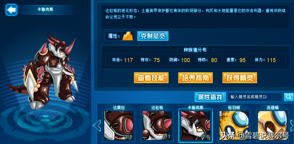卡鲁克斯:这个就不用多说了,不说90%,起码有80%早期雷伊返场后,是靠这精灵打过的。综合强度五颗星,当时地面系最强了吧,虽然猛虎王也强,但猛虎王也不是人人都有。不管是玩防御、玩输出都可以,而且精灵造型霸气,也是当时人手一只的融合精灵,你没这前期你打啥都混不住,竞技主要克制雷伊、火系及机械系精灵。