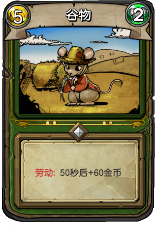 虽然是一款以卡牌为主导的游戏,但它并没有回合的概念,取而代之的设定是时间。比如每次抽牌之后需要等待一定的时间才能再次抽牌,领导人技能使用过后也要等待刷新。当然,玩家也可以用金币来强制抽牌。而许多卡牌则同样要一定时间来发挥作用。比如“谷物”这张牌: