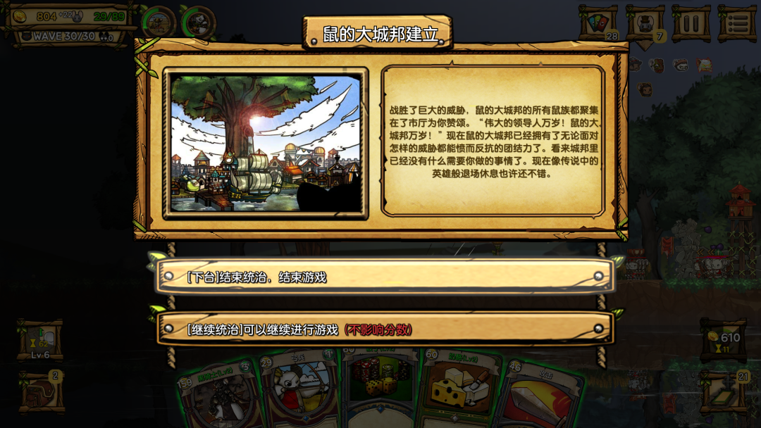 游戏设定的回合只有30轮,意味着只要撑过30轮就通关了游戏。但在30轮战斗结束的时候,会出现是否接着进行游戏的选项,如果接受则会开始无尽模式。