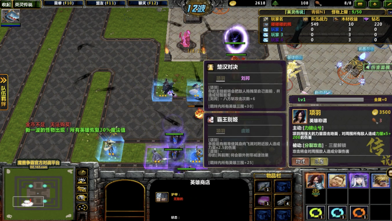 点评:技能朴实无华,爆炸的伤害让人感到”无聊且枯燥”,将项羽放在出怪口颇有一夫当关万夫莫开的气势。巨额的aoe使得许多小兵才出现就被项羽杀死,当项羽与刘邦达成羁绊后项羽释放技能的同时还能将敌人拖拽至身前,对那些血厚移动速度慢的boss怪有奇效。