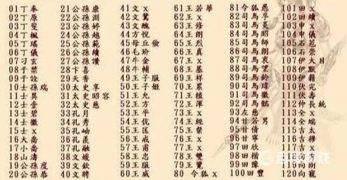 二、17是小乔;18是山淘;19是公孙度;20是公孙恭21是;公孙康22是公孙渊;23是公孙婷;24是公孙越;25是公孙范;26是公孙续;27是公孙瓒;28是卞喜;29是天香;30是太史亨;31是太史昭容;32是太史慈;33是孔月。