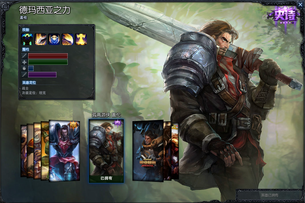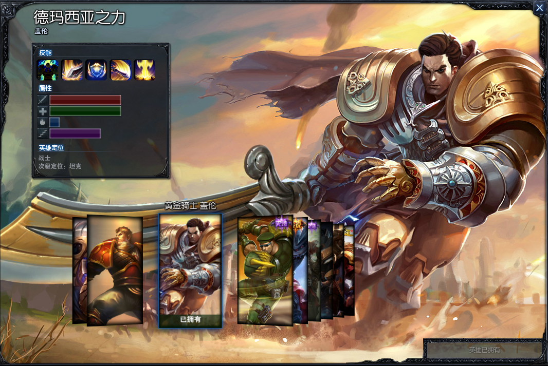 德玛西亚之力—盖伦是每个人都接触到的一个英雄,每每想到盖伦我们都能想到那句经典的台词:“人在塔在”是那么的气势如虹。也是英雄联盟让我们印象最深刻的一个英雄。那么今天小编武警林就和大家谈谈盖伦的皮肤。