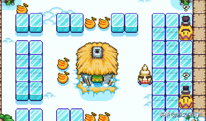 最明显的标志就是屋子:不同关卡中间会有个不同的屋子,比如第一关打小绿牛时是冰屋、第六关打原木怪时是木屋、第16关打蓝牛是是口冰井、第二部开始出现蛋先生时中间是个鸡窝……