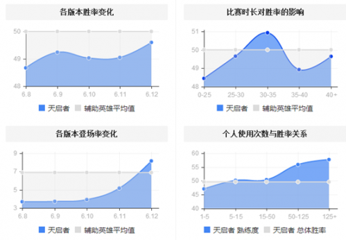 从数据来看,辅助天启者的登场率和胜率都显示出一个上升趋势,配合6.13版本的辅助装备加强来看,天启的胜率可能会再往前迈上一步,比较全体护盾暴走不是开玩笑的。