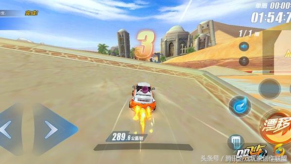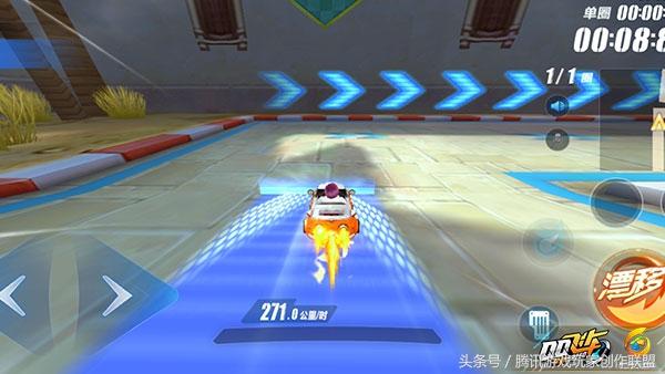 直角弯道,由于过弯时的漂移距离过短,所以往往一个弯道不足以我们积攒大喷。所以在这段赛道的直线处,应该多使用断位双喷的技巧来提高车速。在起跑线前方的第一个直角弯道处,有一个中等长度的加速带,我们可以在这个加速带上,完成一个断位双喷的动作。配合加速带末端的直角弯道,在前期积攒一个大喷。