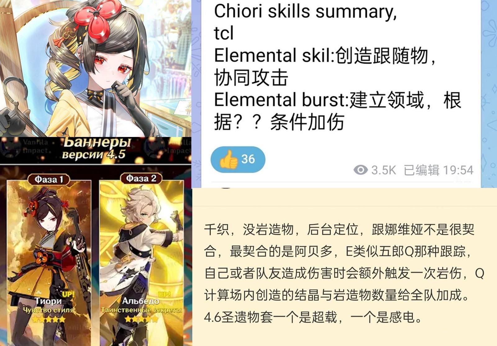 备受关注的4.5千织技能终于有了!E技能创造跟随物,协同攻击。Q技能建立领域,根据条件加伤。千织,没岩造物,后台定位,跟娜维娅不是很契合,最契合的是阿贝多,E类似五郎Q那种跟踪,自己或者队友造成伤害时会额外触发一次岩伤,Q计算场内创造的结晶与岩造物数量给全队加成。4.6圣遗物套一个是超载,一个是感电。