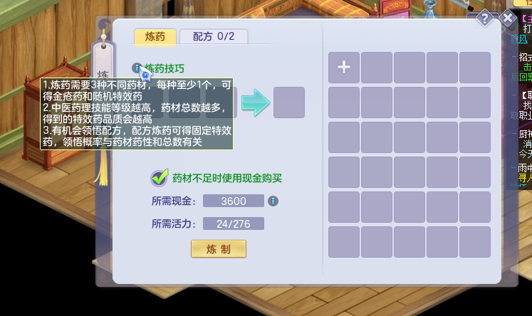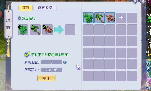 而炼药的方式也很简单,玩家进入炼药界面后,点击加号购买药材,自行组合搭配就能炼制出药物来了,不过在没有药方的情况下,只能多次不断尝试才能有概率产出特效药,这时候最好的办法就是记下药物组合,这样一来产出特效药的概率就会大一些,另一种办法就是提高炼药等级,这样产出特效药的概率也会增大。