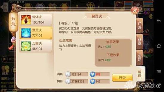 开启一定的帮派等级会随之开放帮派修炼的等级,帮派修炼分为炼体决、聚灵诀、万兽决,增加一定的气血、法力和宠物捕捉成功几率。