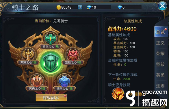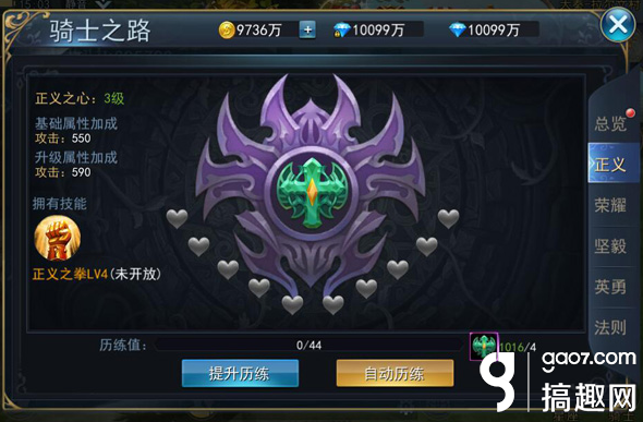 骑士之路需要不同的骑士之心来提升历练,将正义、坚毅、法则、英勇、荣耀骑士之心分别历练满级,并成功挑战副本后就可以提升当前骑士阶位。
