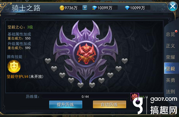 坚毅之心,每次历练提升重击威力,变身骑士后拥有技能坚毅守护。
