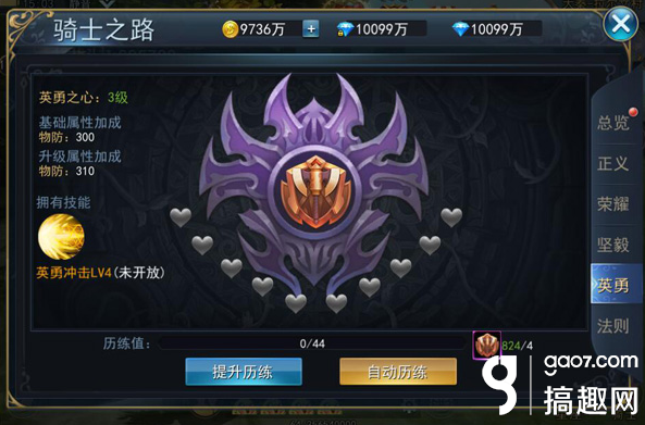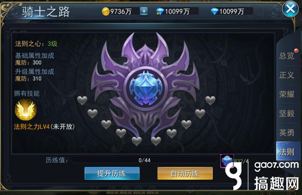 “远征骑士路,漫漫荣耀魂。”这句话是骑士之路的真实写照,系统4级开启,它象征着骑士拥有的正义之心、坚毅之心、法则之心、英勇之心和荣耀之心。