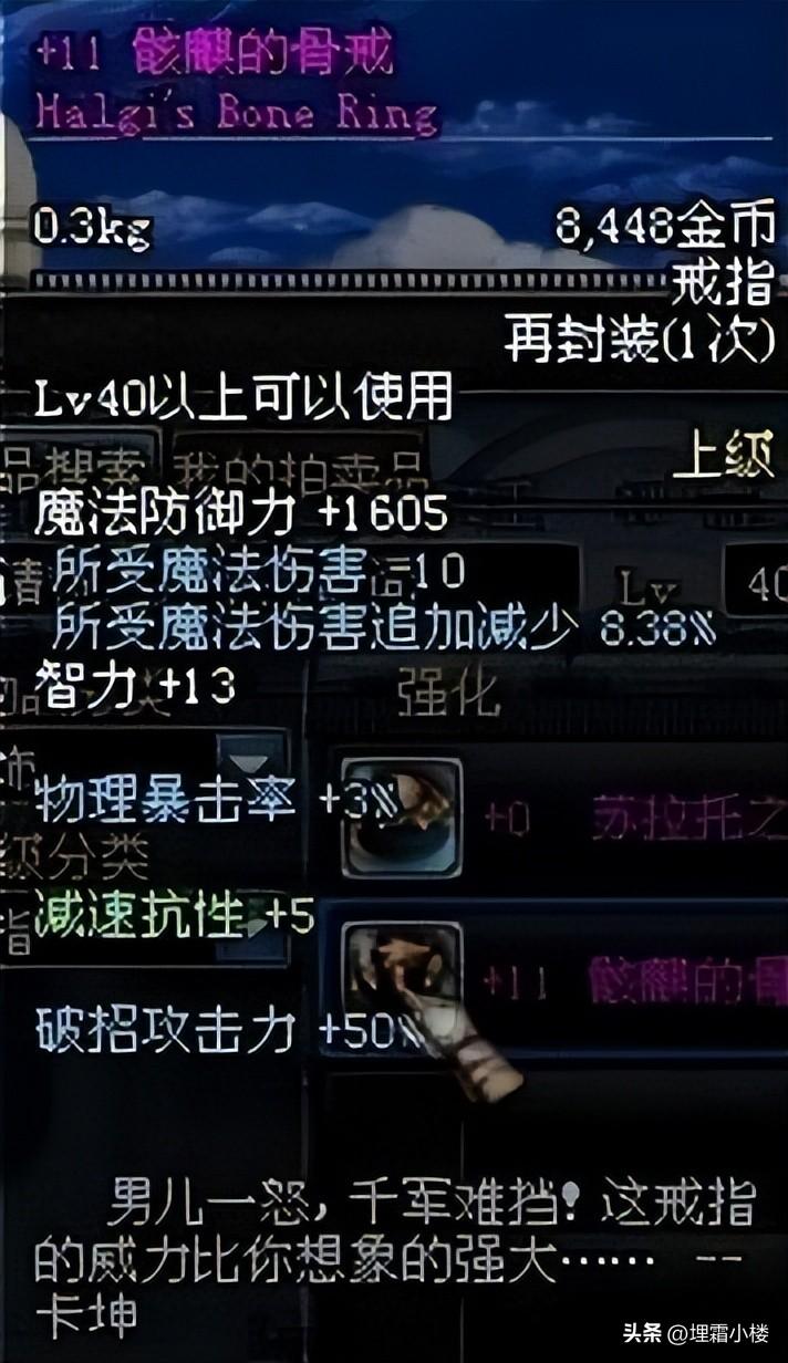 一款戒指被称为是法系骨戒,效果为破招时,魔法伤害增加20%。虽然从纸面上看着挺香,但由于触发条件的问题,完全不如艾尔文戒指实用,以至于成为一件较为冷门的装备。只有刷图大佬才会拿出来耍耍。