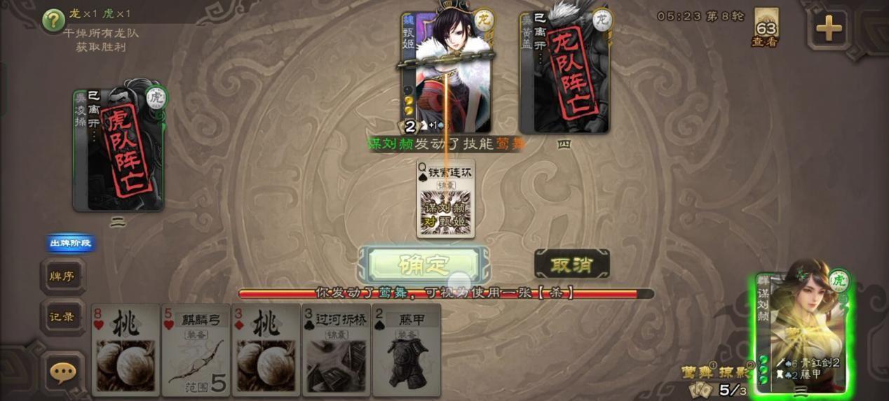 谋刘赪的核心玩法是【杀】和锦囊牌交替使用,从而向拆牌或者出杀这个两个方向推进。谋刘赪一般都是偏向极致爆发流,最多一个回合杀3刀,所以外号刘三刀,具体操作如下: