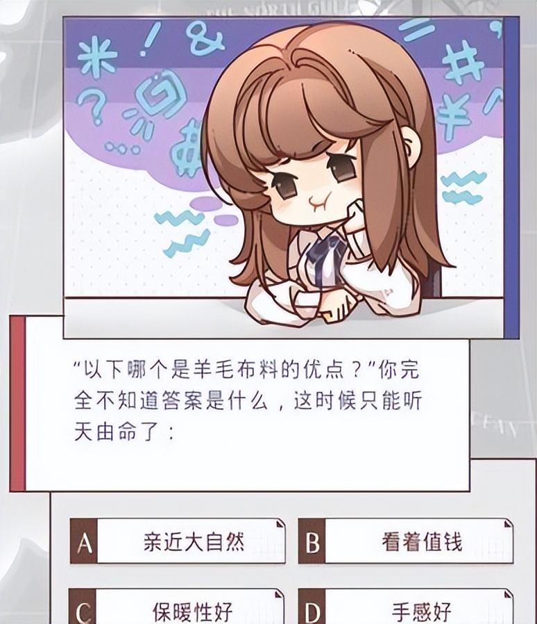 羊毛布料的优点选择保暖性好。这题是比较容易选出答案的,a和b明显错误,d选项羊毛布料和其他布料相比则明显不能作为优点。