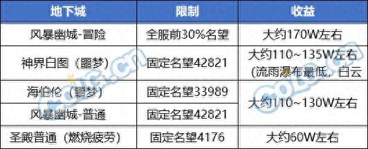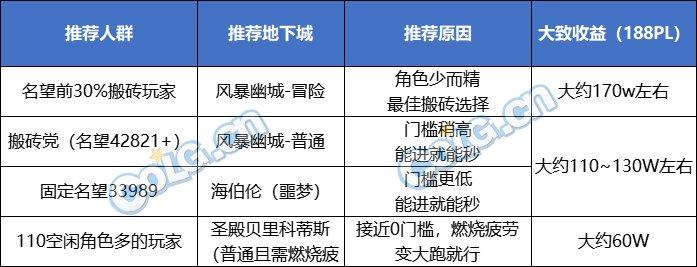 总结:风暴冒险还是单角色最高档位,不能进的首推海伯伦,神界白图性价比很低不推荐,燃烧普通圣殿能进就能过4~5分钟一个号(适合有较多满级空闲角色的)玩家。当前版本评分难打,一般情况下不能按照3S考虑收益。
