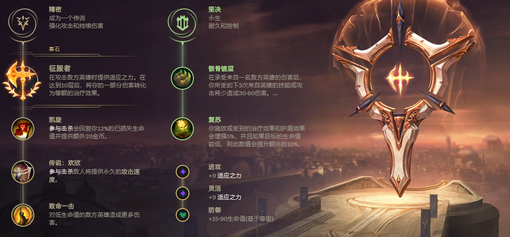 符文基石选择征服者,然后点出凯旋攻速和致命一击,副系选择复苏和骸骨镀层,复苏可以提升W技能的护盾强度和回血效果,镀层可以提升抗击打能力,出门装选择多蓝盾,技能根据对线英雄选择,如果对线诺克或者奥拉夫可以学W,配合征服者的回血,诺克一级就算是打出血怒也是打不过我们的,因为我们最不怕的就是站撸,至于奥拉夫和他拉扯就好,注意走位不要吃太多Q也是可以打过的,对线其他上单就可以学Q,消耗升级,升到二级如果对方想打架可以学W,先平A三下打出被动,然后粘着他A,最后大锤收手,如果敌方想一直和你打W攥住不要放,等自身血量下降给敌人可以击杀错觉的时候再放,这个时候你的对手是懵逼的,三级基本连招就是先手E近距离服务,然后三锤打出圈圈,最后一锤收尾,六级之后也是同理,先小锤四十安排他三下,打出被动,然后接E近距离服务,最后大锤八十收手,如果对方不满意,想要跑,直接开R关进小黑屋进行售后服务,最后收取服务费,这个时候注意被动不要断,W当做杀手锏来用,不要过早释放,一定要在关键时刻再用,这里讲一下对线鳄鱼,因为鳄鱼W技能带有破盾效果,所以你开W之后直接转换成生命值,不要留盾,不然被直接打没,会影响存活机率,加点推荐主Q副E,装备方面因为我们定位属于·法坦,所以偏向加生命值和法强的装备,如下图。