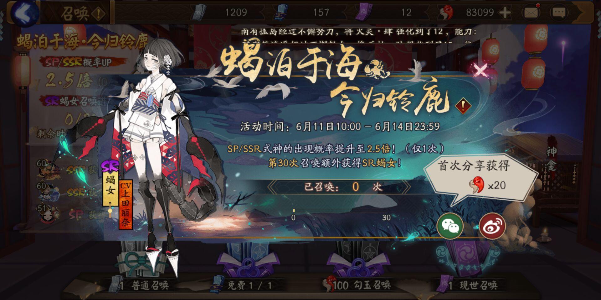 这30抽蓝票扔给蝎女,对于这么一个半仓管的式神,是否真的值这30蓝票自己衡量,比较合理的思想就是30抽收手,能触发SSR/SP概率UP最好,触发不了拿个蝎女闪人也不亏。如果真的一张蓝票都不想扔进去的话,那直接砸百鬼就好。