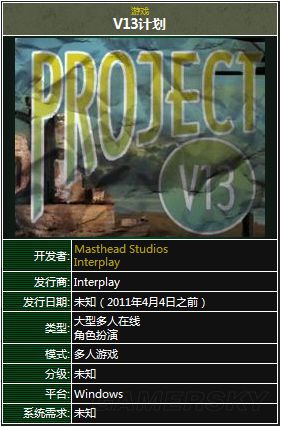 Studios正在开发的大型多人在线游戏,开发代号为V13计划。前辐射开发人员Chris
