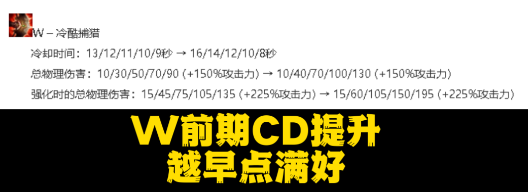 这次的改动具体为成长攻击力与生命值的提升,W技能每级增加的伤害提升,每级减少的CD变多,R技能每秒造成伤害全等级提升。