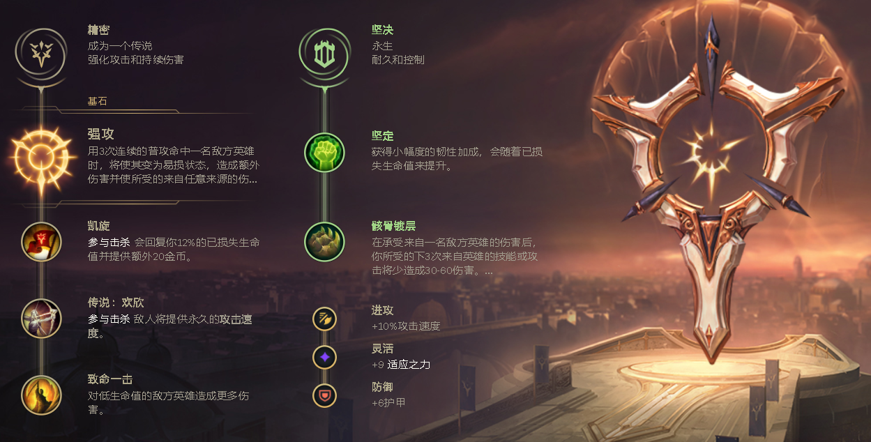 首先看符文,既然是为了对位优势,那么强攻的性价比是一定高于征服者的。毕竟鳄鱼AW或者红怒W即可触发强攻,点出强攻后能让鳄鱼的EAWQE无伤换血连招更有效的压低对手血量,在被对手先手时,更快触发的AW带来的伤害也不比征服者低。后续则是推荐点出凯旋、欢欣与致命一击。副系推荐选择坚决系的骸骨镀层+坚定或复苏之风+复苏组合。