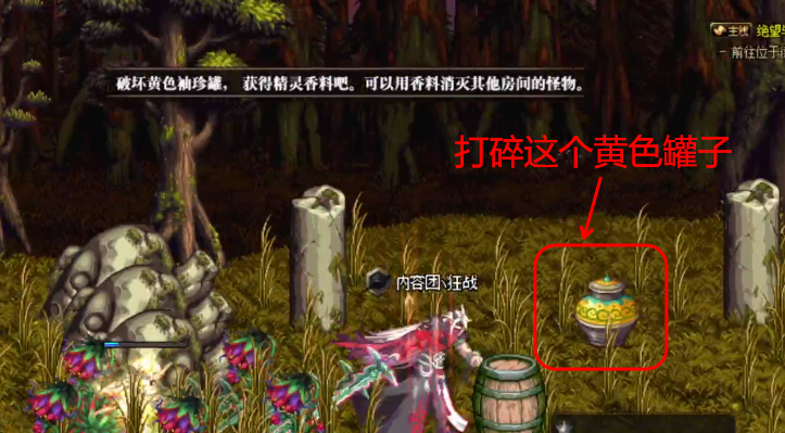 进入关卡后往右走第一个房间,能看到黄色的香料罐(屏幕中间有提示),打破后捡起精灵香料。