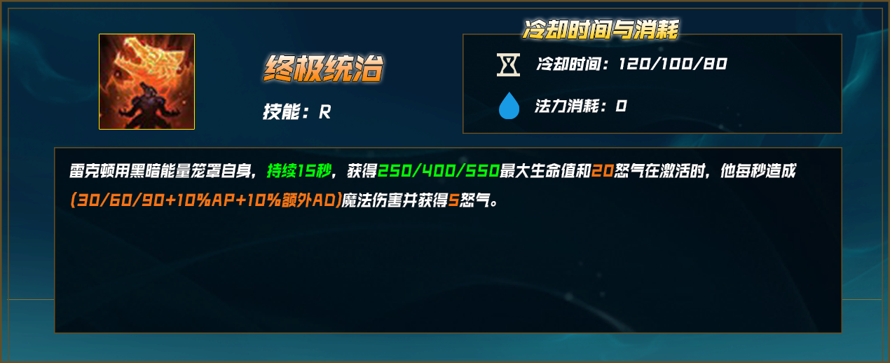 雷克顿的大招本来作为魔法伤害就不低,完全可以开大期间打出很高额的伤害,这次加强更是大大提高了斩杀线,不计算装备和征服者的情况下,只面板就能有900的魔法伤害