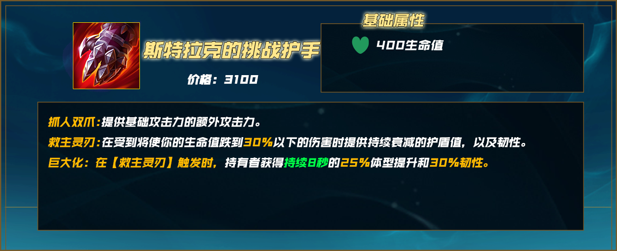 鳄鱼的基础攻击力很高,开启大招后增加额外生命值可以提高血手的护盾量,新版的血手还能提高韧性,所以作为第二件装备是非常合适的