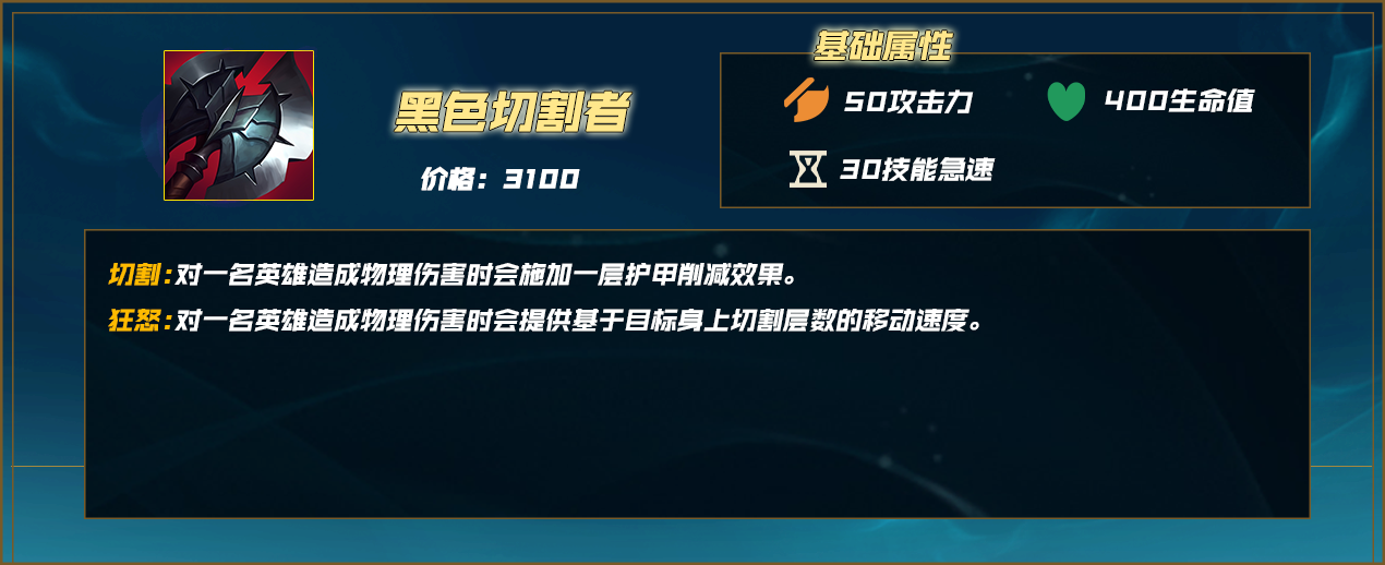 如果优势不够大,就继续单挂锯齿保证伤害,然后做出黑切。因为这套装备坦度比较低,所以需要依靠技能急速多打出Q的回血和E的位移,来增强我们的容错率,后续再补出血手即可。