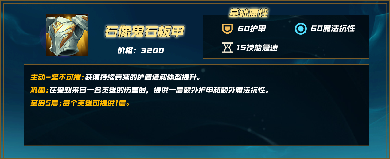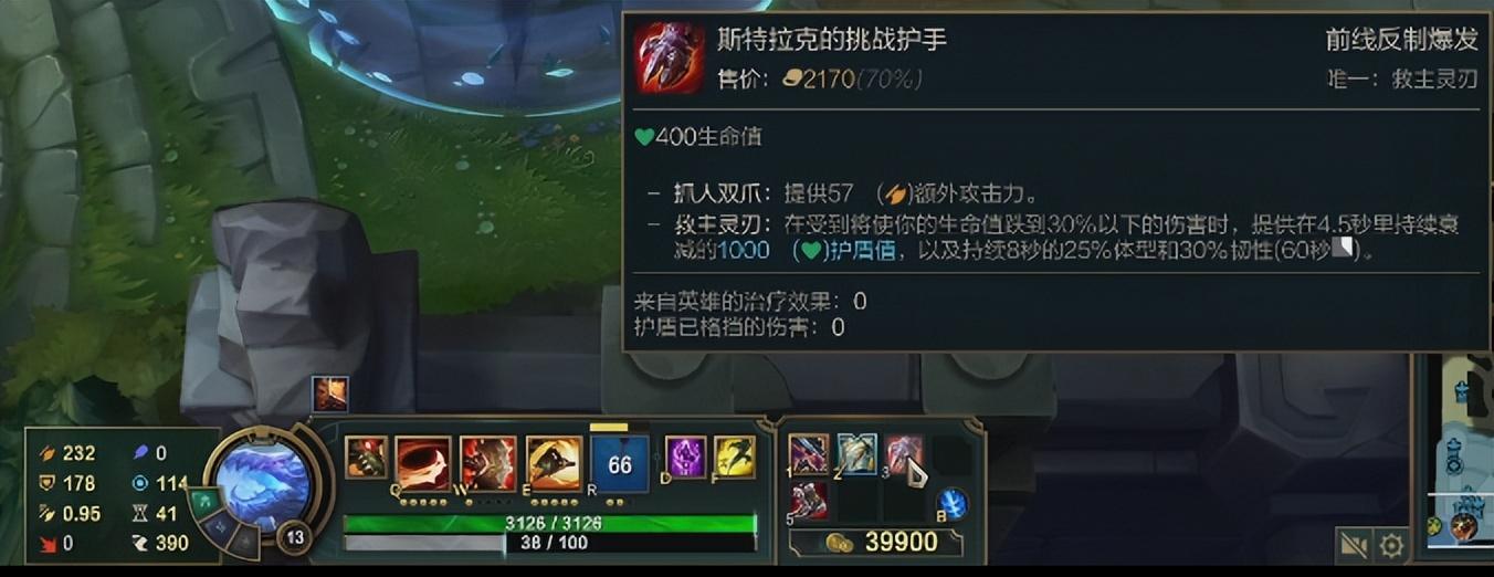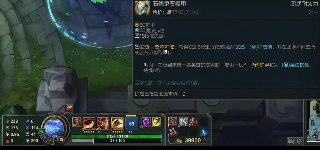 如果缺坦度,第三件就先合成石像鬼板甲,凭借石像鬼+血手+大招抬的血量,我们在团战中非常能抗。13级开启大招后,血手能提供1000护盾,石像鬼能提供1125的护盾,大招能提供400的血量,还有Q和咳血的回血,只能用战神来形容。