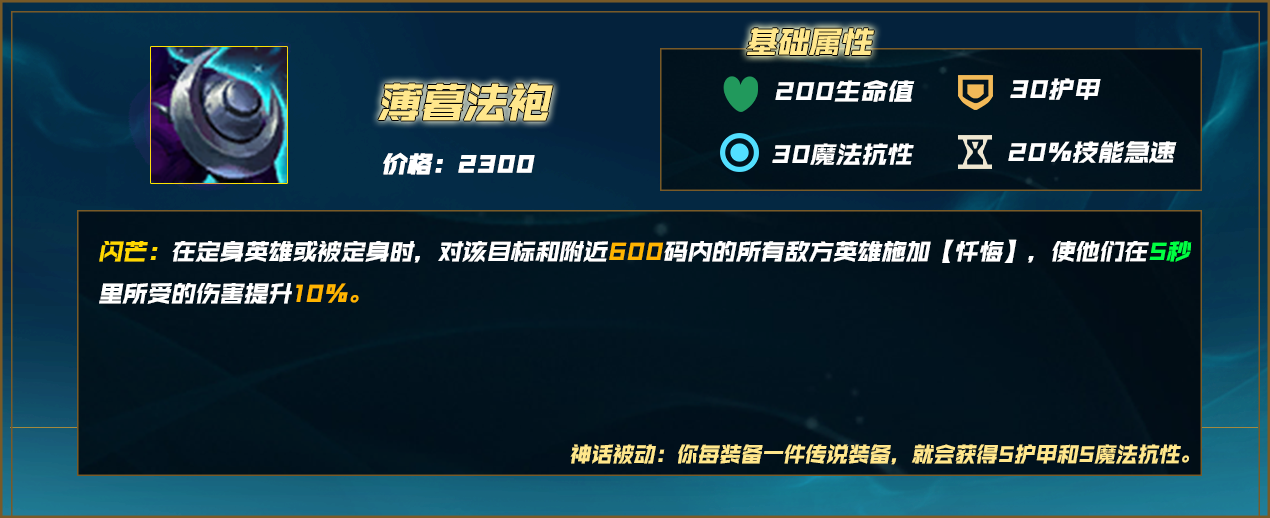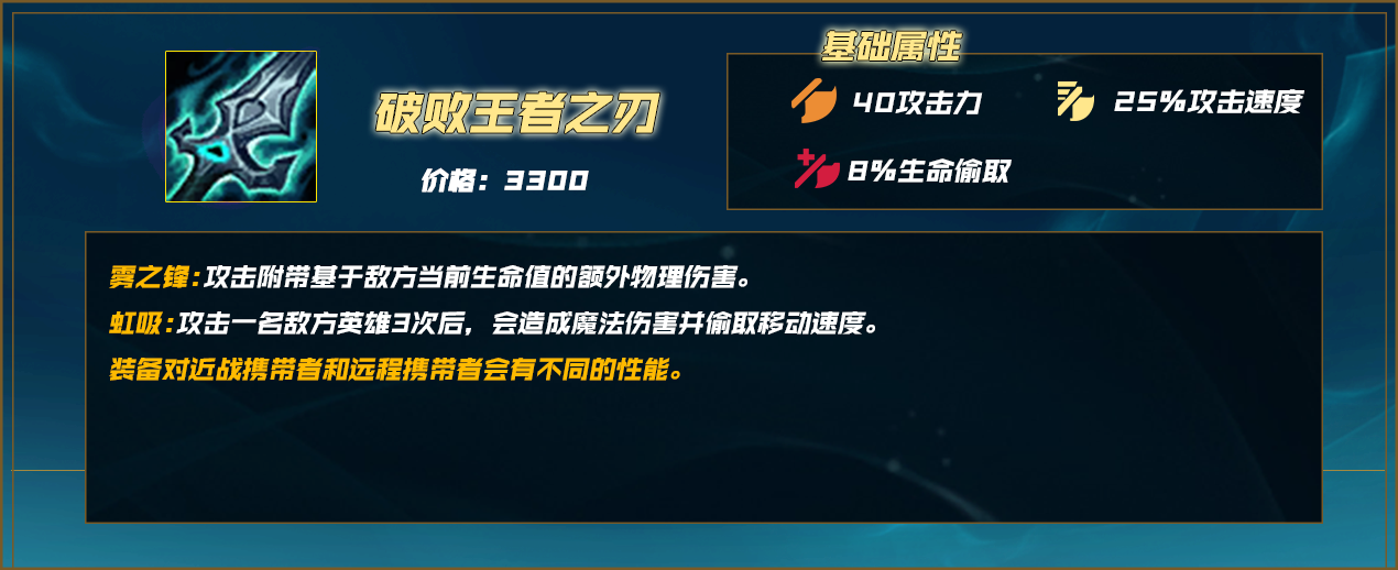 破败+薄暮法袍+血手。在需要出破败单带,但是对线期没法打出太大优势的时候,可以尝试破败+法袍。