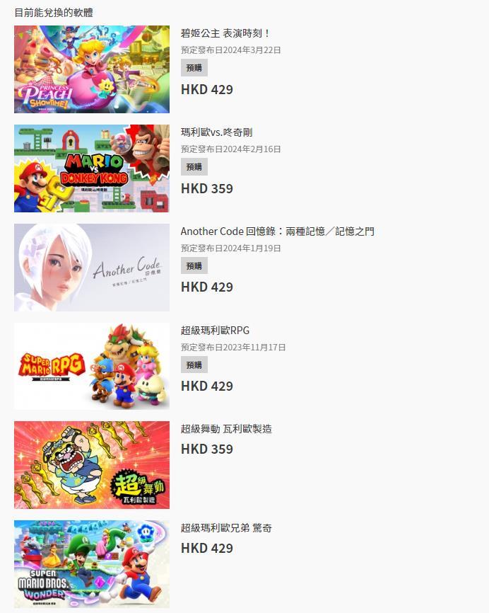 除了此前能够兑换的游戏外,本次还新添加刚刚发售的新游戏:《超级马里奥兄弟:惊奇》和《超级舞动:瓦里奥制造》,未来即将发售的游戏也在兑换游戏列表中,包括:《超级马里奥RPG》、《碧姬公主:表演时刻!》、《马里奥vs咚奇刚》、《异色代码