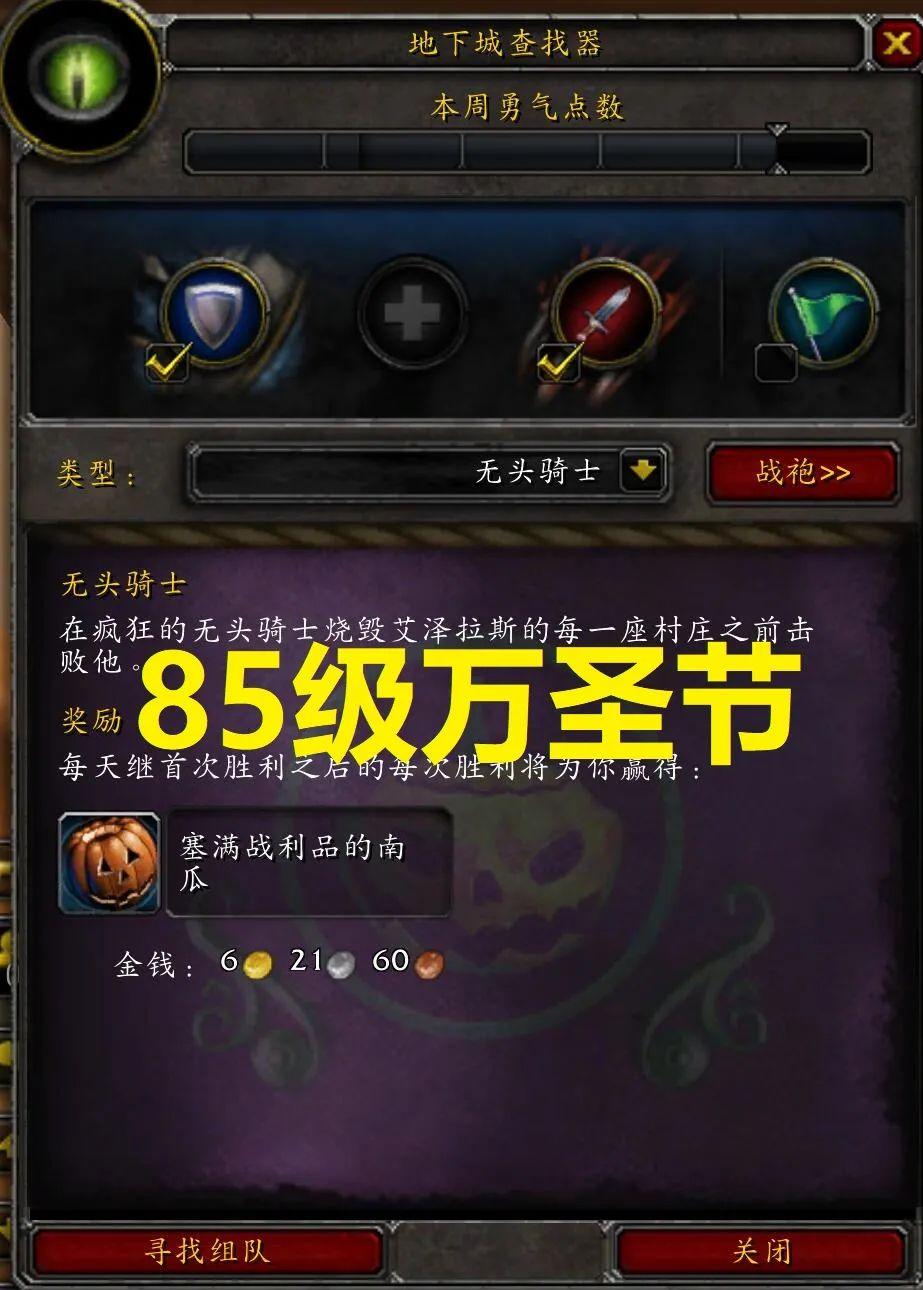 虽然暴雪提升了万圣节节日BOSS无头骑士掉落的装备等级,但是在P4阶段区区232装等实在是不够看,绝大多数玩家对于这些装备也没有太大兴趣。不过正所谓失之东隅收之桑榆,万圣节在P4阶段开放也并不是全无好处。巫妖王之怒怀旧服P4阶段开放了随机地下城查找器,节日BOSS改为用地下城查找器排队。