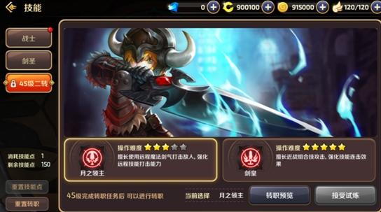 剑圣到达45级时同端游相同也可进行二转,两个转职方向分别为月之领主及剑皇