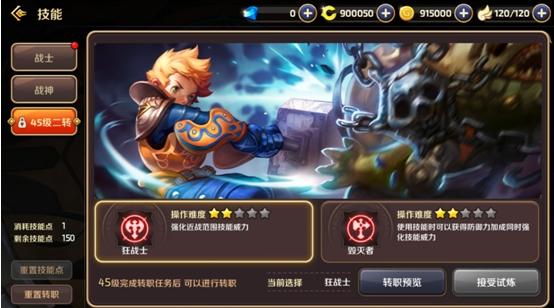 战神到达45级时同端游相同也可进行二转,两个转职方向分别为狂战士及毁灭者