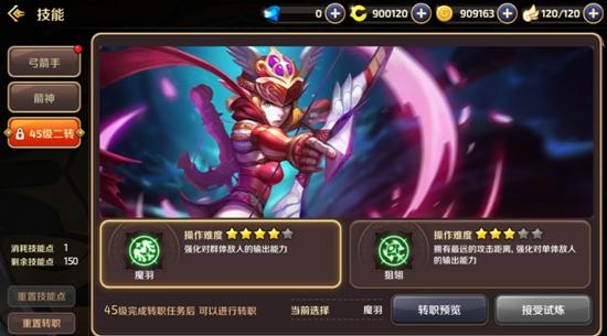 箭神到达45级时同端游相同也可进行二转,两个转职方向分别为魔羽及狙翎