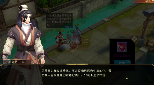 很多时候,在路边走着走着,不小心点了一个NPC,就能触发一个奇遇任务,什么帮落魄书生找丢失的铃铛啊,帮老奶奶打水啊,去军营里偷羊肉汤啊,都是些有趣的小故事。