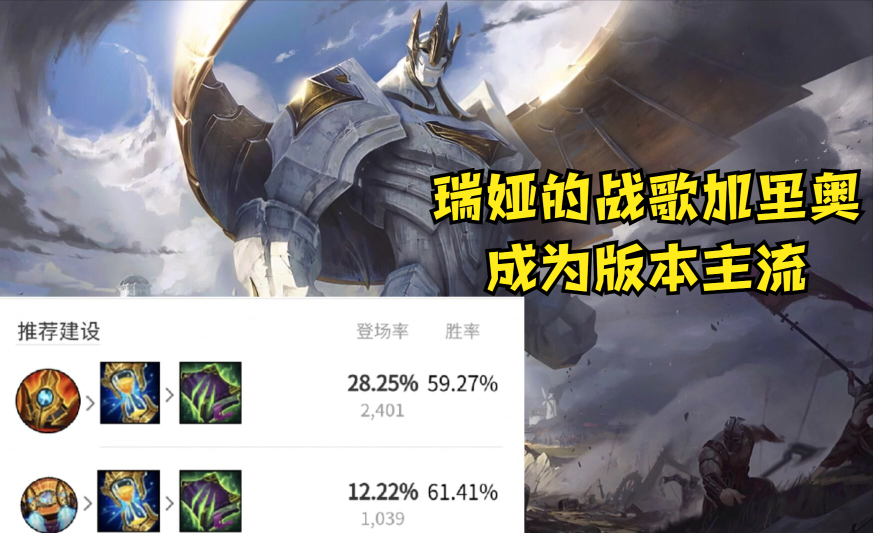 在当中版本之中韩服的高端局当中也是流行起了“瑞娅的战歌”(皇冠)这件装备,在前几个版本当中瑞娅的战歌中单加里奥确实有出现过一段时间,但是在接下来的几个版本当中这个套路则是在高端局当中一直没有超过推推棒,但是在当前版本之中,瑞娅的战歌加里奥则是突然崛起,在韩服钻石四以上的对局记录当中,加里奥出瑞娅的战歌的出装选择率则是远超过推推棒的选择率。也是能从登场率数据当中看到在当前版本当中,瑞娅的战歌的这件装备的高端局的出场率也是到达了28.25%并且胜率也是达到了59.27%,这远远高于推推棒的12.22%的登场率,反而胜率才比瑞娅的战歌高出了2%左右。那我也来说一下为何当前版本瑞娅的战歌突然崛起的原因。