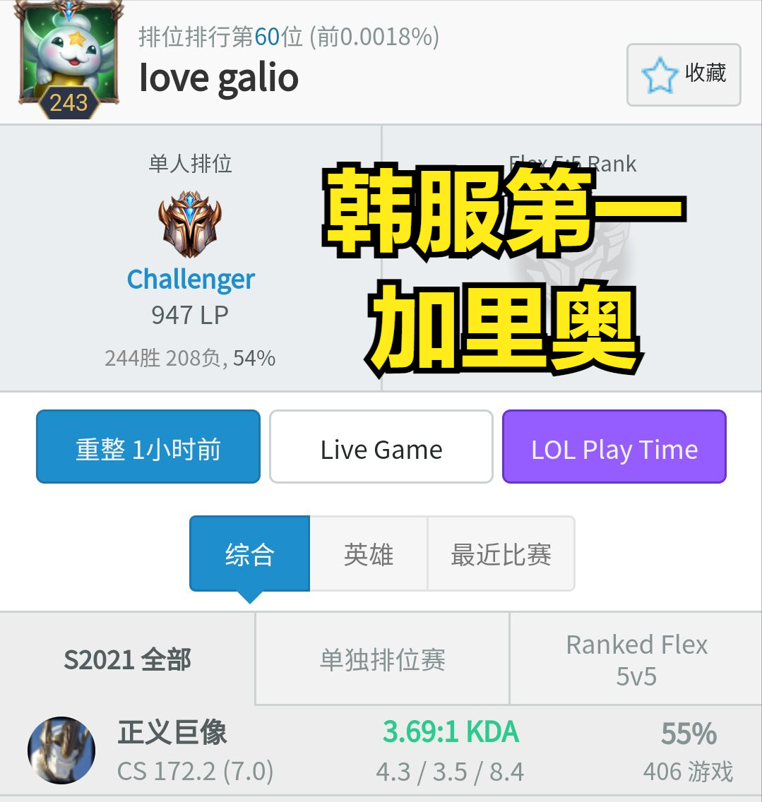 为了更好地为大家介绍“瑞娅的战歌”加里奥的玩法,这里也是为大家找到了当前韩服第一加里奥的出装选择和符文点法(这个韩服大神在当前版本之中一共使用了406场加里奥,并且也是以54%的排位胜率,排在当前版本的韩服第60位,可以说是加里奥人柱力也不为过)。